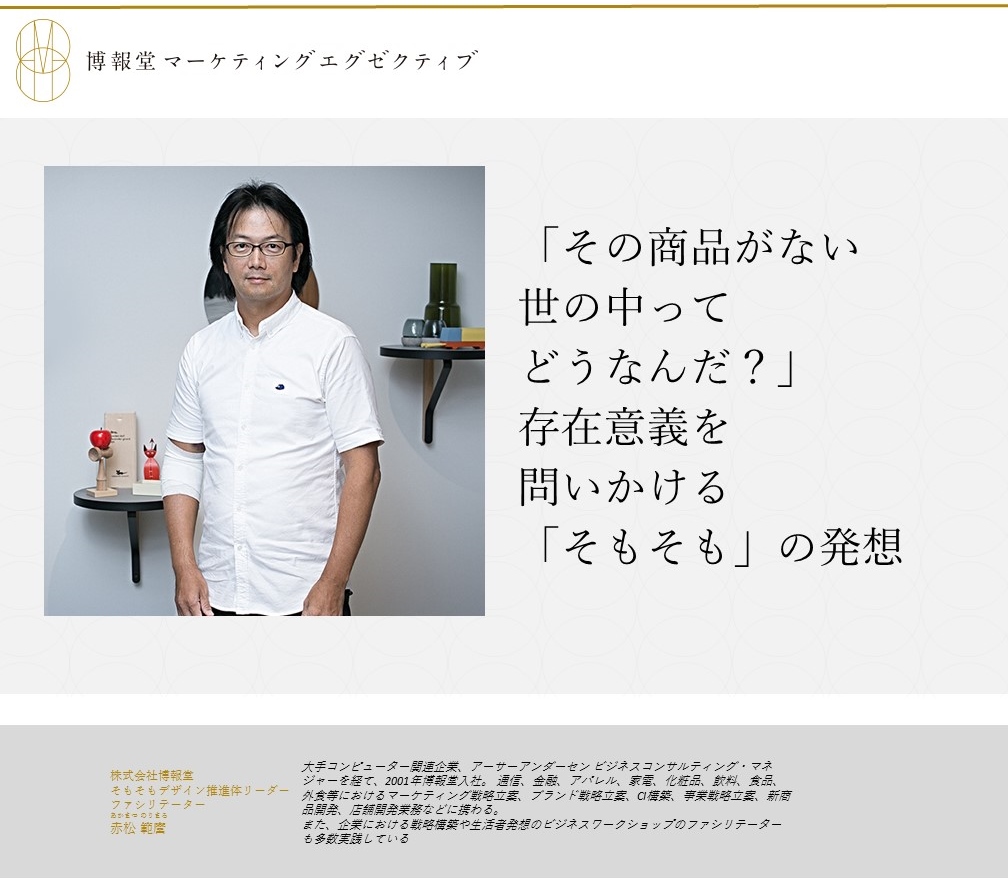 赤松 博報堂は社外の方から「デザインの博報堂」と言われることがあります。そこで改めて、博報堂のデザインというのは、いったいどういうものなのかをデザイナーを集めて話してみたことがありました。そこで見えてきた博報堂のデザイナーがやっていることは、おしゃれとか格好いいということではなく、その商品/ブランド/企業がなぜ存在するのか、つまり存在意義の見える化だということでした。これは博報堂に脈々と流れるデザイン思想であり、そこから「そもそもをデザインする」という言葉が出てきました。
