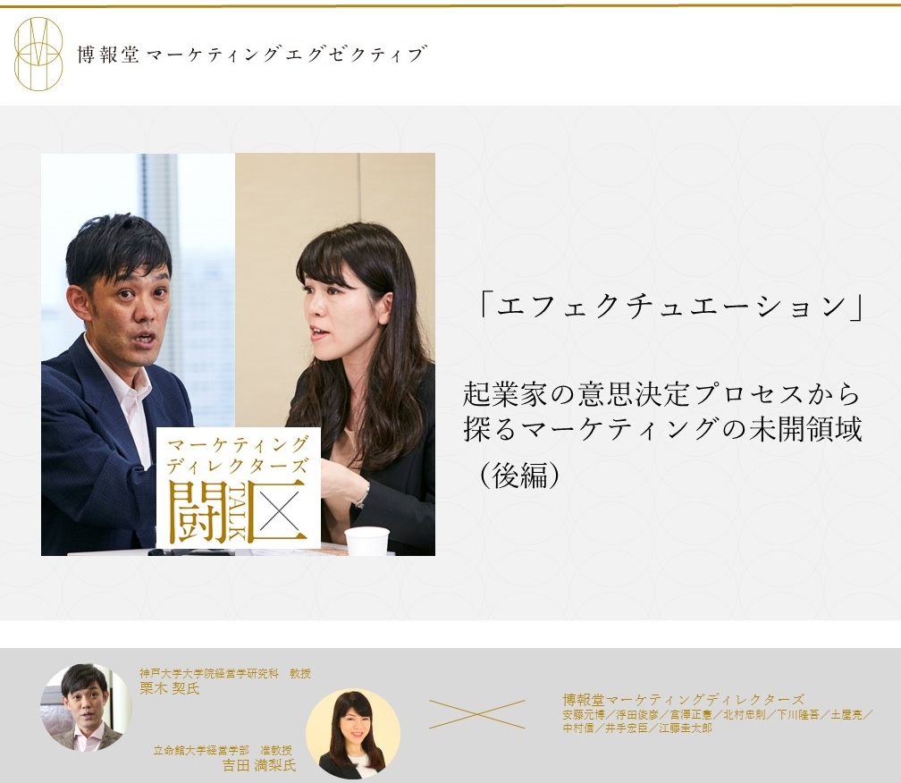 吉田 博報堂マーケティングディレクターズのみなさんは、マーケティングのスペシャリストであると同時に、エフェクチュエーションの発想をすでに取り込んでいる面があることがわかりました。本業のリフレーミングを伴うようなエフェクチュエーションのスキルを組織的として持っていない企業も、みなさんのような方たちが外部から貢献することで、それができるようになるのではないか。今日の議論を通じて、そう感じました。