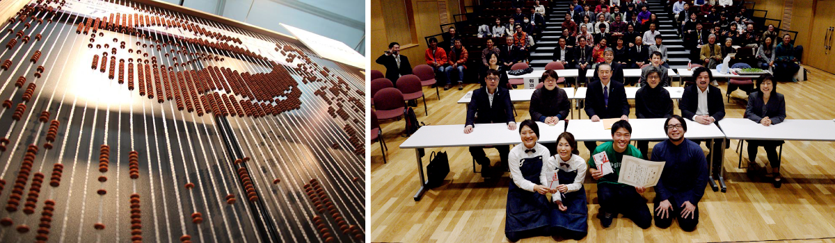完成したのは、リハビリ機能を備えたそろばん珠のアート作品です。すだれに取り付けた数十個のそろばんの珠を上下に動かして自由に絵を描くことができ、しかも指を使うことで認知機能の向上などに貢献するという実用的機能を備えたもの。患者の方にとってリハビリは現在でも孤独で辛い作業ですが、健常者と一緒に楽しみながら知らず知らずにリハビリができるというこの作品の機能が高く評価され、2016年のTokyo Design Weekの学生賞部門で最高賞であるグランプリを受賞しました。