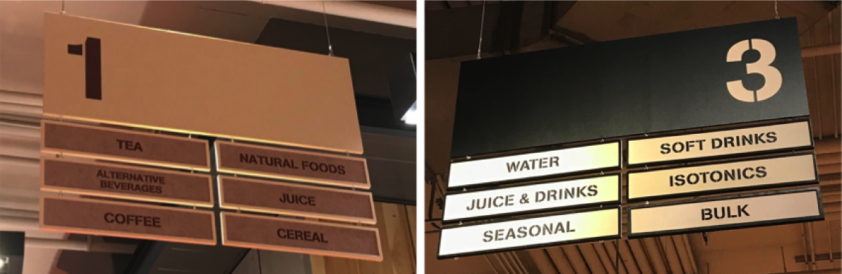 これはカナダ大手スーパー内の売り場コーナーの看板です。よく見ると、1番の売り場にも3番の売り場にも「ジュース」が置いてあります。1番の売り場には低カロリーや100%果汁のジュース等が置いてあり、3番の売り場には炭酸飲料等が置いてありました。どうやらクリーム色の看板が健康や原材料に気をつかった商品の売り場。黒色がそれ以外の売り場なようです(ちなみに売り場の数は黒色の方が多いです)。同じジュースや食べ物なのに売り場が離れているのは少しややこしい気もしますが、こちらの人はこだわりのあるものはクリーム色の売り場から。それ以外は黒色の売り場からと、ここでもまたどちらかに偏らず、無理なく両方から選択している姿が見て取れました。