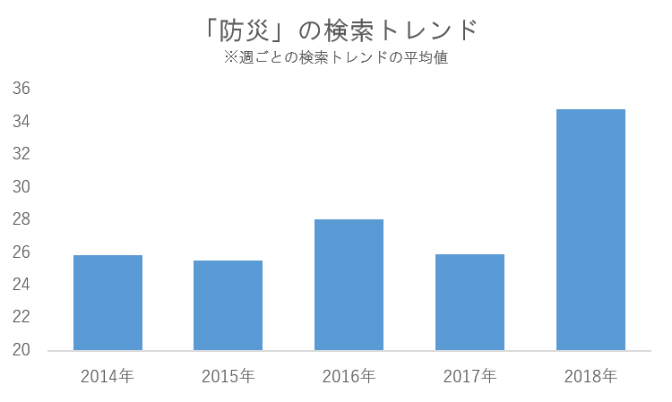 なぜ、非・非常食の習慣を実践している人が増えているのかについても考えてみました。まず、前提として、生活者の防災意識が高まっていることは上げられると思います。Google Trendで「防災」について検索数の年推移を見てみると、昨年は地震や台風が多かったこともあり、例年に比べて多くの検索がされていたことが分かります。そんな中で、普段の生活の中に具体的な防災アクションを取り入れようとする人が増えているのだと思います。