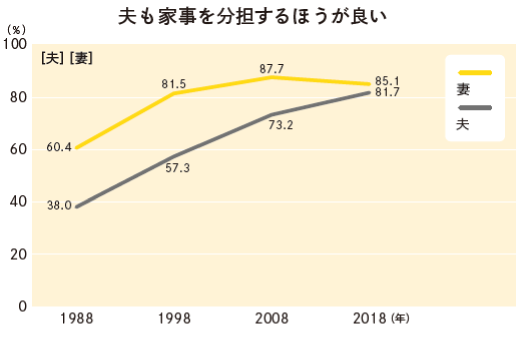 十河 一方、「夫も家事を分担するほうが良い」と考えている夫は1988年には38.0%しかいなかったのに、2018年には81.7%まで増えています。同じく妻も、60.4%から85.1%に伸びています。育児に関しても傾向は同じで、夫も妻も8割以上が家事を夫婦で分担するのがいいと考えていることがわかります。