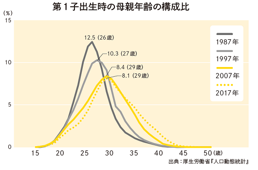 夏山 女性のライフステージが揃わなくなってきているのもそのためですよね。「第1子出生時の母親年齢の構成比」をみると、1987年はピークの26歳に12.5%が集中。22歳から29歳の8年間に7割以上の人が第1子を出産していました。それが時代とともに出産の適齢期が分散してきて、2017年にはピークの29歳に8.1%しか集中していません。40代になってから第1子を出産する人もいるほどです。