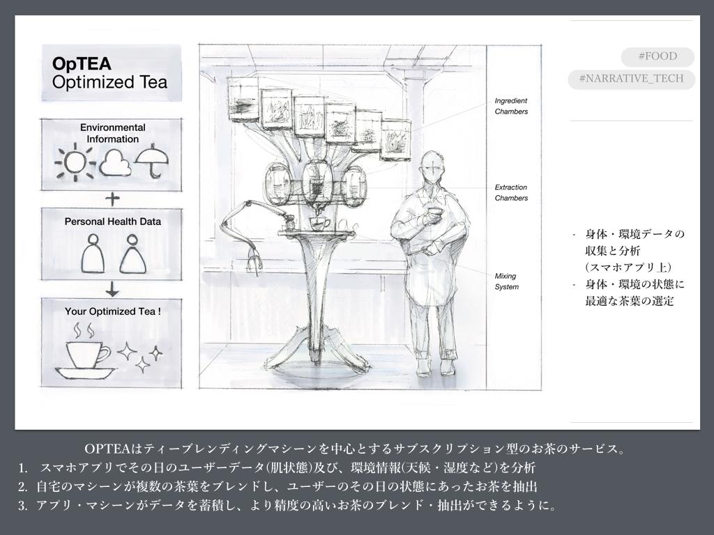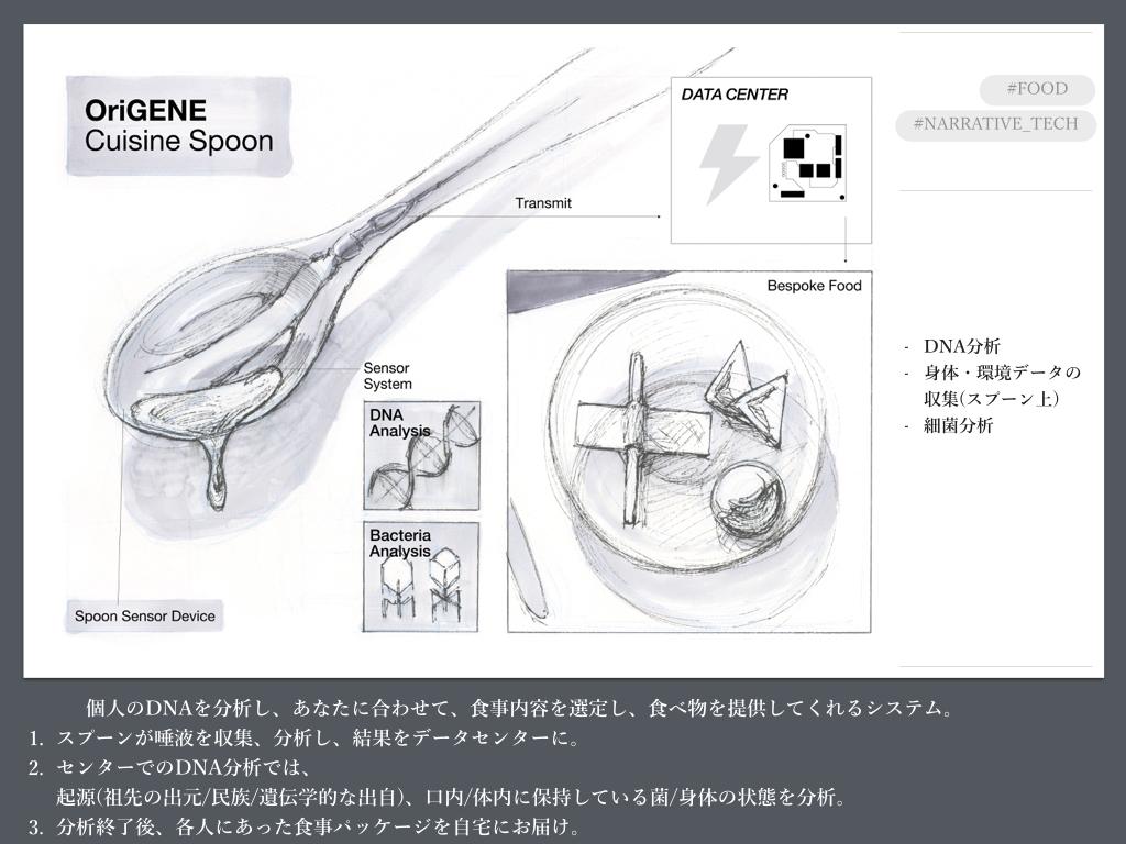 デザイナーがビジュアライズを行う際に用いる情報には、デザイナーが見ている未来の世界観に関する情報が多分に含まれています。参加者がそうした情報に触れることで、まだ世の中に存在しないものであっても、未来の世界観をより具体的に獲得できるようになると考えました。たとえば「OriGENE Cuisine Spoon」では、革新的なテクノロジーを持ったスプーンそのものの他に一皿の食事が描かれていますが、この食事、よく見ると現代には存在していないものであることが分かります。