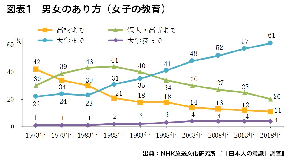 村田 子どもの教育に関する意識も変わっています。仮に中学生の子どもがいた場合に、どの程度の教育を受けさせたいかという質問があります(図表1)。以前は、男子は大学までの教育を受けさせたいが、女子は高校までや短大まででいいと考える人が多かったのですが、1988年調査からは、女子でも「大学まで」という回答が増えはじめ、2018年では61%となっています。平成の30年間で最も変化が大きかったのがこの項目です。おそらく、86年の男女雇用機会均等法施行の影響が大きかったと思われます。もっとも、男子の教育は大学まで必要と考えている人は2018年に72%で、男子と女子の間にはまだ10ポイントほどの開きがあります。