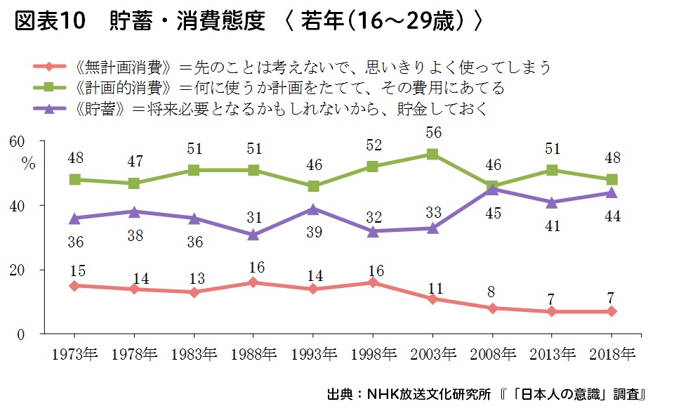 吉澤 おっしゃるとおりですね。若年層をみると、2018年調査では、73年と比べ、「無計画消費」は半減しています。一方で、「貯蓄」は以前より増えています。高齢者よりも若者に将来不安があるという傾向の表れかもしれません。