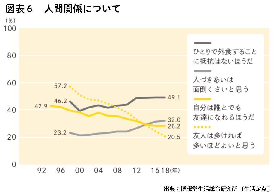 三矢 生活総研の調査「生活定点」では、多くの人たちが「公」よりも「私」を重視するようになっているという結果が明らかになっています。例えば2018年の調査では、「日本の政治・経済に関心がある」人が5割を切って過去最低になっている一方で、「日本人は、個人生活の充実にもっと目を向けるべきだと思う」人が35%と過去最高になっています(図表5)。また、人間関係についての質問では、「人づきあいは面倒くさいと思う」という人が増え、「友人は多ければ多いほどよいと思う」という人が大きく減っています(図表6)。社会や人間関係よりも「私」を重視する傾向が強まっていると考えられます。