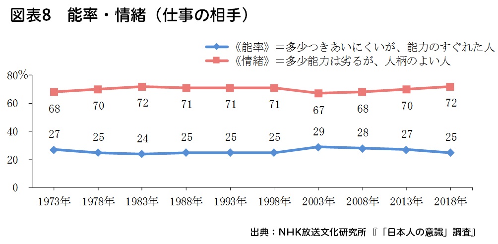 それから、そのふたつほど割合は多くはないのですが、一緒に仕事をする場合、「多少つきあいにくいが、能力の優れた人」と「多少能力は劣るが、人柄のよい人」のどちらがいいかという質問(図表8)では、後者を選ぶ人が常に7割くらいを占めています。また、「理想の仕事」についての質問で「仲間と楽しく働ける仕事」を選ぶ人が多いというのも一貫しています。