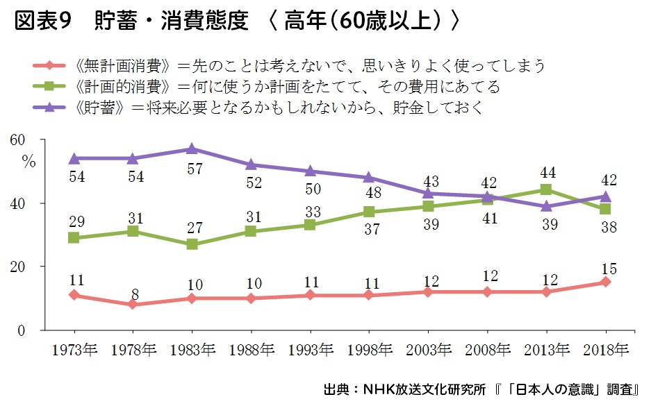 ただ、年齢層ごとにみると、高年層(図表9)は「貯蓄」が以前は多かったのですが、近年はその割合が減って「計画的消費」が増えています。その理由を考えるに当たって、『生活者の平成30年史』の「高齢者30年変化」がたいへん参考になりました。本では、昔の高齢者は老後に対する漠然とした不安があったけれど、現在の高齢者はどんなときにどんな問題が起こるかを想定しやすくなっていると指摘されています。「不安」が「対処すべき明確な課題」になったということです。その結果、先が見通せるようになって「貯蓄」の割合が減った。そういう見方もできると思いました。