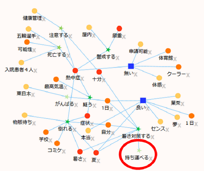 そこで、暑さ対策について、株式会社エム・データ(http://mdata.tv/)による『TVメタデータ』を用いて、最近TV番組で話題になっている“暑さ対策”を調べたところ、こまめな水分・塩分補給、保冷剤や氷などで身体を冷やすことに加えて、前述の“かぶる”以外に、“持ち運べる”ものがよく紹介されていました。実際に、ソーシャルメディア分析Topic Finderで見てみても、“持ち運べる”ものへも注目されている様子がわかります。