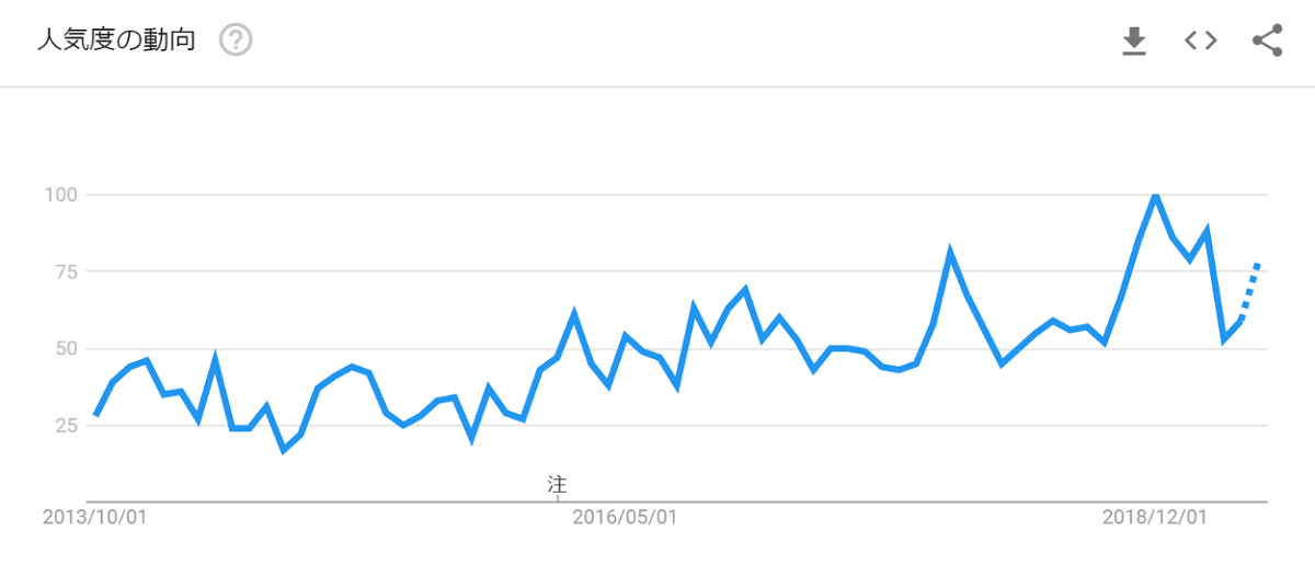 実際、Googleトレンドで「メンズコスメ」の検索量を見てみると、2016年ごろから右肩上がりに伸びており、注目が集まっていることが分かります。