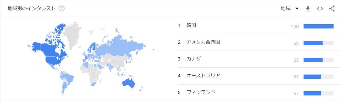 さらに意外な音声に注目が集まっています。ASMRと呼ばれるもので、特に若者の間で人気が広がっています。ASMRは、Autonomous Sensory Meridian Responseの略で、日本語に訳すると、「脳がとろけるようにゾワゾワする気持ち良い反応」のこと。本能を刺激する音って感じですかね。具体的には、本のページをめくる音、シャンプーの音、焚き火の音、耳かきをする音など。そしてなんと食べ物の咀嚼音もよく聴かれています。リラックス効果があるようで、仕事中や寝る前などに聴かれています。僕もいろいろ聴いてみましたが、焚き火の音はとても心地がいいのですが、咀嚼音はちょっと苦手でした。。ちなみにASMRは、日本だけではなく世界中で話題になっており、Googleトレンドで見るとここ5年間で3倍以上検索数が増えています。地域別でみると韓国、アメリカ、カナダが上位で、日本は18位でした。