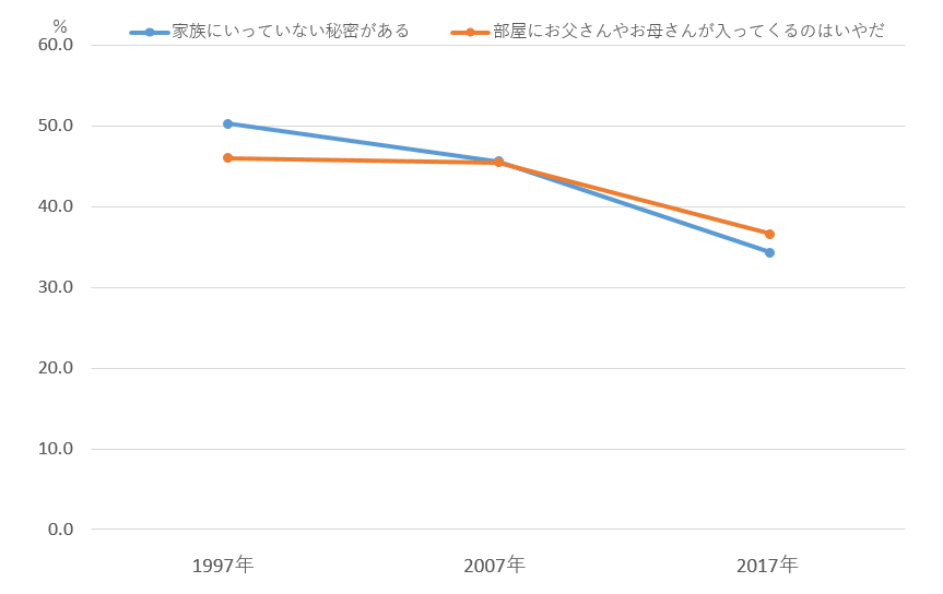 博報堂生活総研の「こども20年変化」調査結果では、部屋に親が入ってくるのを嫌がらなくなったり、家族に言っていない秘密がなくなったりと、”どんどん近づく親子の距離”が1つのトレンドとして発表されています。あと、 LINEグループを作って、常にやり取りをしている親子も多いですよね。