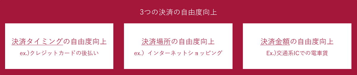 2つ目は“決済場所の自由化(どこでも決済)”です。すでに身近になっている例では、インターネットショッピングでの決済も“決済場所の自由化”にあたります。現金のみの決済であれば、お店にいって直接支払いをする必要があるところを、クレジットカードや携帯キャリアの決済サービスを使うことで家にいながらの決済を実現しています。