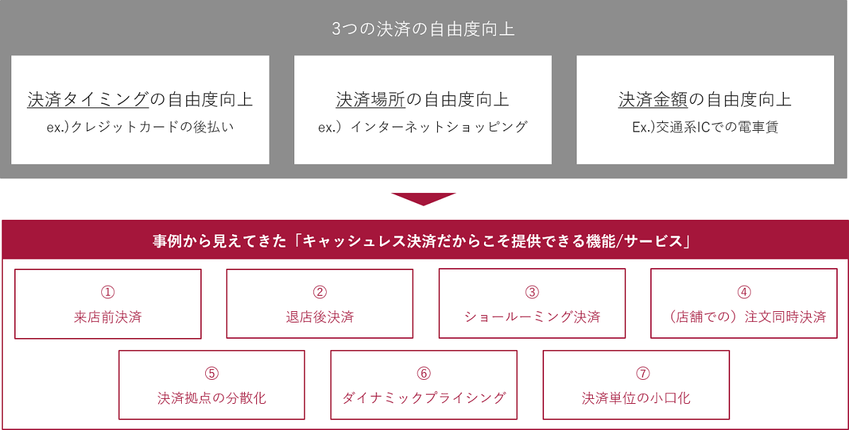 ここまで見てきた、決済の自由度が高まることで提供可能になる7つの機能は、結果的に店舗やサービスの体験全体を変化させています。キャッシュレス化は、「単に決済自体がスムーズになるという“決済体験”の革新」ではなく、「“店舗・サービス体験”全体を革新する起点となる」ということがお分かりいただけたかと思います。