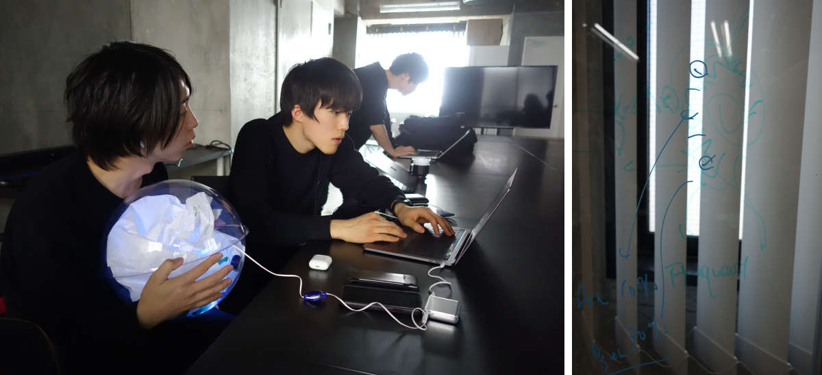 風船型なら表面積が大きいので体に密着して振動が伝わりやすいし、抱きかかえると温かい気持ちになれる。しかも、風船なら安価です。でも柔らかすぎると振動を再現できないのでもうちょっと硬い素材で作ろうとか、いろいろと工夫を凝らしてプロトタイピングが進みました。
