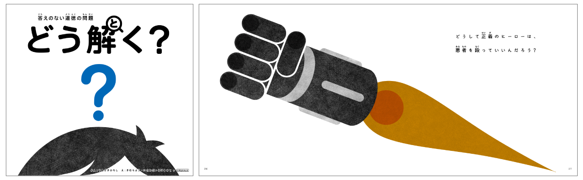 すべての問いには「導入コピー」を付けています。いきなり問いを投げかけるのではなく、まず子どもたち本人の普段の生活を思い出してもらうことで、問いを理解しやすいマインドをつくる工夫です。例えば、「今日もお母さんに怒られた。人を殴っちゃダメ、って」という導入コピーの次のページに「どうして正義のヒーローは、悪者を殴っていいんだろう?」という問いがきます。