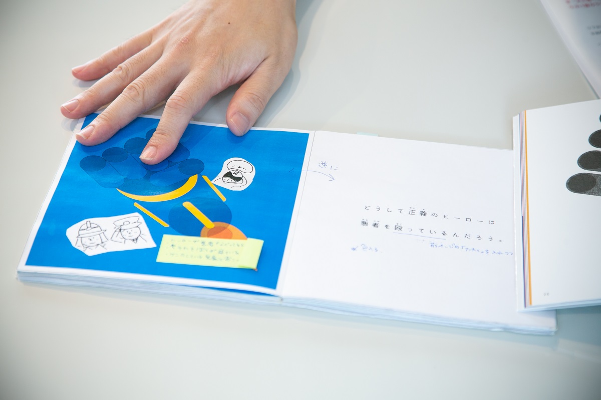 そうして出会ったのがポプラ社の方々でした。最初のプレゼンでは、完成版の本にも掲載されている「どうして正義のヒーローは、悪者を殴っていいんだろう?」、「蝶々を殺して、ネコを殺しちゃいけないのは、どうしてだろう?」、「国と国のケンカは、どうして怒られないんだろう?」という、正義、命、戦争をテーマにした3つの問いを見て頂きました。