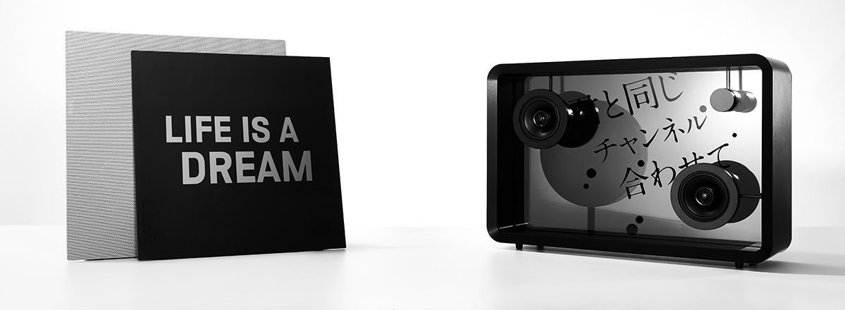昨年から、新ラインとして「リリックスピーカー・キャンバス」も発売しています。リリックスピーカー・キャンバスも、リリックスピーカーと同じく、音楽とともに歌詞を味わうためのスピーカーです。こちらはレコードのジャケットを2枚重ねて立てかけたようなデザインで、言葉をインテリアのように部屋に飾るというコンセプトで開発しています。