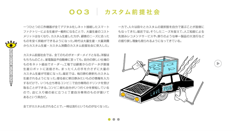 では、岩嵜はどのような手法で生活者の未来像を導き出しているのか。博報堂では未来の兆しになるような記事を収集し、それを「フューチャーブックマーク」として保存。それをもとに「未来シナリオ」を作成している。いくつか例を挙げると、「感情みえる化社会」「うっとうしいロボとの生活」「カスタム前提社会」といったユニークな未来像が描かれている。(こちらで全シナリオを閲覧することができる http://innovation-design.jp/future-script/)