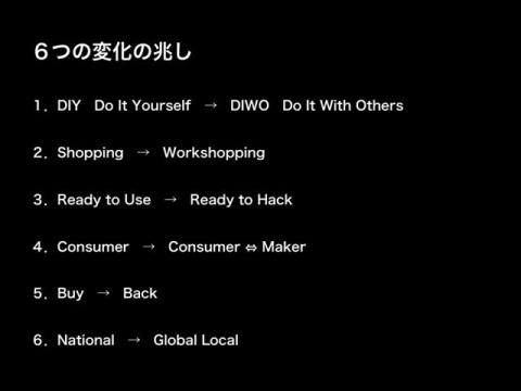 ちょっとしたものづくりと言えば、「日曜大工」に代表されるように、お父さんが休日に小屋に籠もって何かをつくる「DIY」が主流だった。しかし、3Dプリンタやレーザーカッターが置いてあるメイカースペースが増えたことで、「Do it With Others」。誰かと一緒にものをつくることが価値となった。