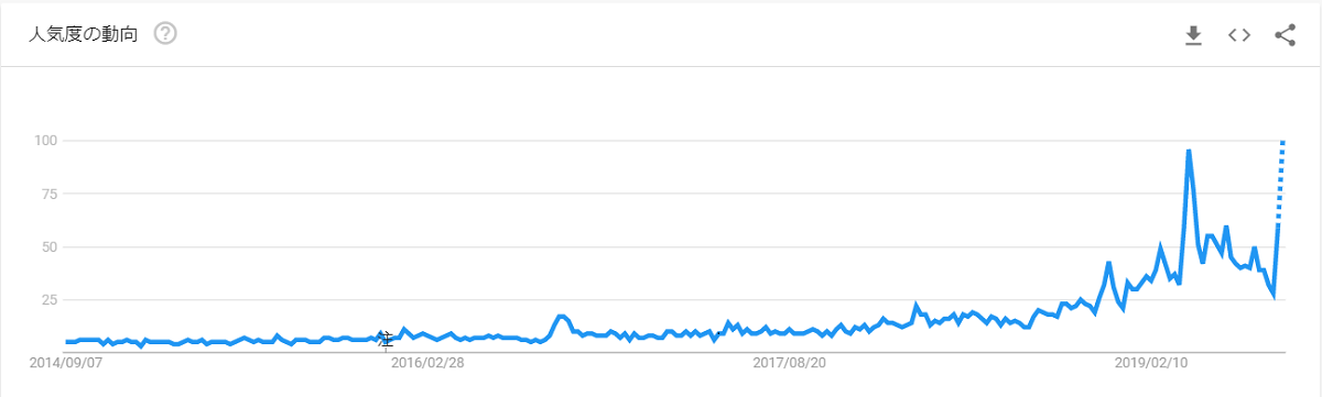 2020年は、第5世代移動通信システムである5Gが日本でも始まる「5G元年」でもあります。Googleトレンドで調べてみても19年以降急速に検索数が上昇していることがわかります。5G が始まると通信できる容量が大きく上がり、IoT化はじめ様々な社会の在り方が変化すると言われていますが、その一つがロボットを介した遠隔医療です。