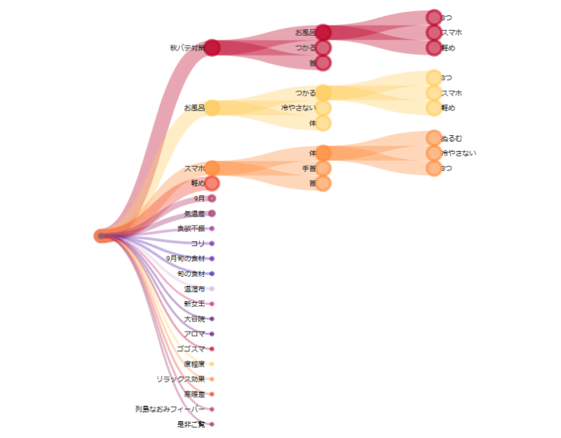 「秋バテ対策」でTwitterのつぶやきを検索してみると、「お風呂」「温湿布」「食材」など体を外と内から温めることに関連するつぶやきが多く見られます。