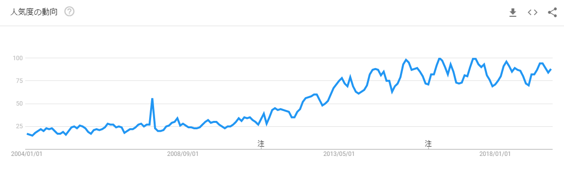 また、Googleトレンドで「疲れ」というキーワードを検索すると年々増加傾向にあります。この原因は定かではありませんが、酷暑など気候の変動や、ネットの普及による情報過多など、社会環境の変化によって日本全体の疲労度が増しているのかもしれません。