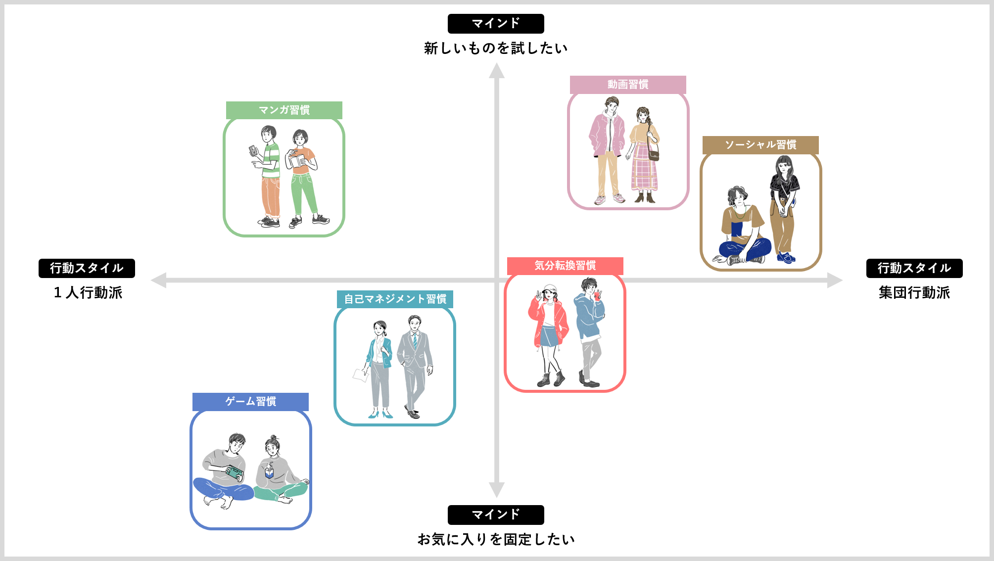 次に、行動スタイル面では、集団行動派と1人行動派に分かれます。集団行動派の「動画習慣」「ソーシャル習慣」「気分転換習慣」クラスターは、アウトドア中心にみんなで楽しむことが多いため、仲間内の口コミ拡散も期待できるでしょう。一方、1人行動派の「マンガ習慣」「自己マネジメント習慣」クラスターは、ダイレクトに直接アプローチする手法が有力だと考えられます。
