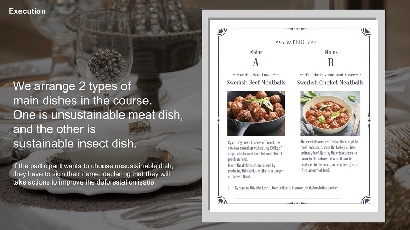 僕たちのアイデアは、このイベントをハックして、メイン料理を二種類用意すること。一つは普通の肉料理で、もう一方は昆虫などを使った肉の代替料理です。代替料理を選ぶ場合はお咎めなし、ですが、肉料理をチョイスした人には、「今後この問題の解決にむけて取り組んでいく」という書類にサインをしてもらいます。
