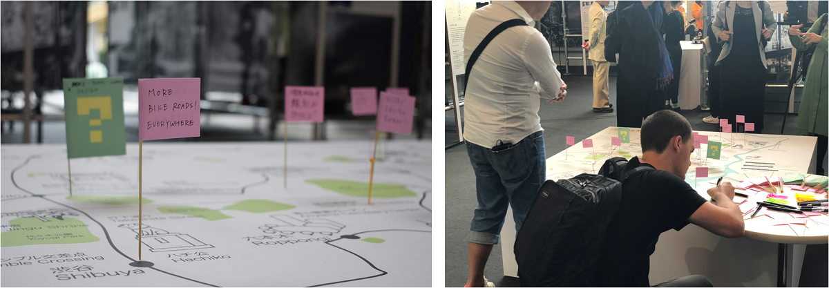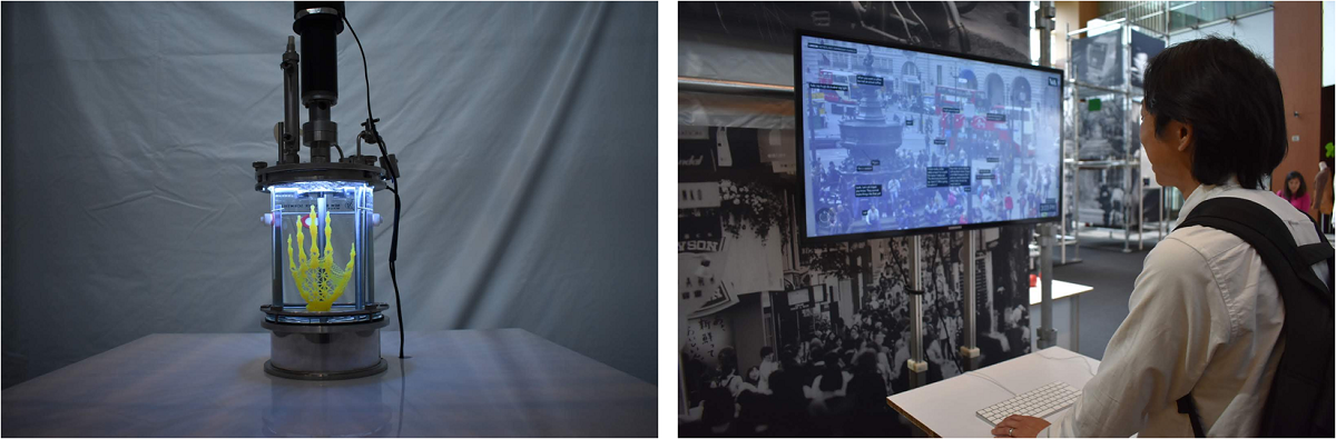 まず、アート作品・プロトタイプ展示では、FIS TOKYOへ参加するイノベーターの作品・活動・プロジェクト、企業による未来のプロトタイプが展示されました。鑑賞者に、驚きや発見、共感など様々な感情を呼び起こすような刺激的な作品たちは、今回のFIS TOKYOにて設定された3つのテーマ(DEATH-LIFE in Tokyo、TECH-SKIN in Tokyo、PUBLIC-PRIVATE in Tokyo)について考える機会を与えてくれます。会場の中心には、東京をよくしていくための意見を共有するための地図「THE FIS MAP」があり、来場者の方々もそれぞれの意見を旗に書き込んでいました。