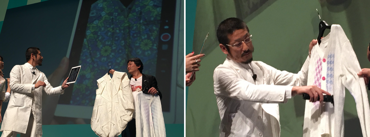 そして、ゲストスピーカー: aiboの開発責任者であるソニーの松井直哉さん(ソニー AIロボティクスビジネスグループ 商品企画部 統括部長)と、森永邦彦さん(ファッションブランド「ANREALAGE」デザイナー)が登場し、お二人自身がどのようにして「Obsession(妄想)」を「Stimulation(刺激)」に変換しているのか実演を交えて話してもらい、そこから同時並行で様々なキーワードを引き出し、スライドに投影していきました。