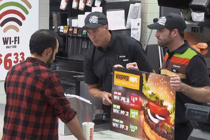 そうなると通信会社が特定のコンテンツの配信速度を遅くしたり、早くしたりすることが可能になり、スイスイ高速でゲームなどのネットコンテンツを楽しむためには高い料金を払わないといけなくなることも考えられるわけです。耳を疑うような話ですが、同じワッパーを手に入れるのに$25.99という高額を払うとすぐに手にできて、$4.99という常識的な金額だと延々待たないと食べられないという比喩でそれをわかりやすくデモンストレーションしてみせました。