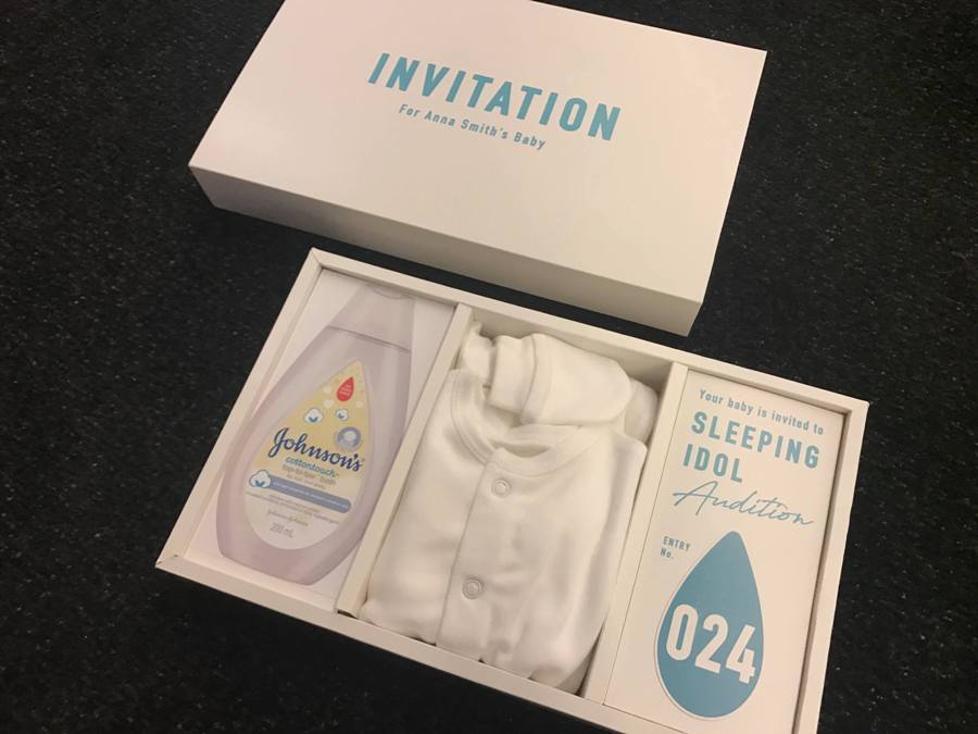 「ギフトボックス」=育児に役立つリアルグッズや、赤ちゃんが遊べるインタラクティブなおもちゃの詰め合わせなどを提案したチームもありましたが、僕らのギフトボックスは「INVITATION」。つまり、ジョンソン・エンド・ジョンソン、ひいてはギフトの送り主からの「あなたのベビー、可愛いのでぜひ、応募してね!」という“お誘い”に建付けを変えました。オーディションの時って、胸にナンバープレートつけるじゃないですか。そのプレートとINVITATION CARDをセットにし、我が子が眠ったら胸にのっけてパシャリ⇒インスタでアップを誘導する “応募キット”ですね。