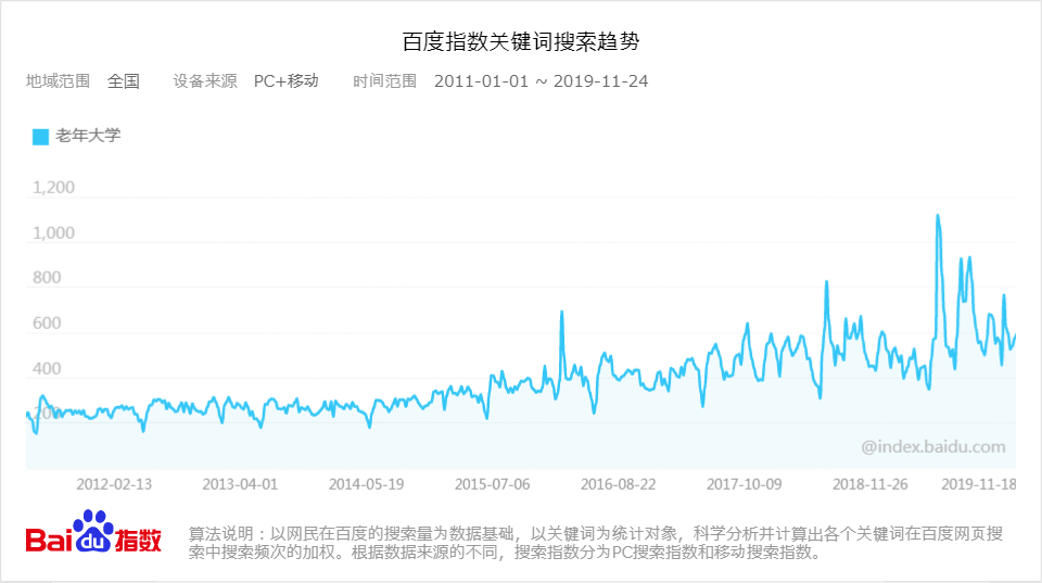 高齢化が加速する中国では、2025年までに60歳以上の高齢者人口が、総人口の5分の1にあたる3.3億人に達すると予想されています。そのような状況の中、受講希望者が急速に増加することにより入学難が問題になるほど「老年大学」への関心も年々高まっています。Baidu指数の推移を確認すると、「老年大学」は人気上昇の一途をたどっていることが見て取れます。