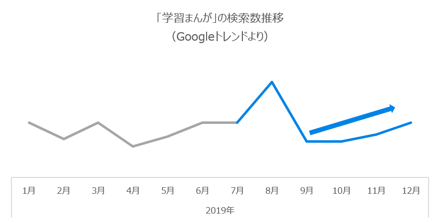 実際に、習慣が広がっているかを確認するために「学習まんが」の検索傾向をGoogleトレンドで見てみました。2019年8月に大きな山ができているタイミングで、情報番組で最近の学習まんがについて、子どもだけでなく大人にも役に立つものが多いという内容の特集が組まれています。その後、9月に一度落ち込んだものの、年末にかけて徐々に上昇トレンドに入っていることがわかります。今後もこの傾向が続くようであれば、まずます「大人の簡短ラーニング」習慣も広がっていくのではないかと考えられます。