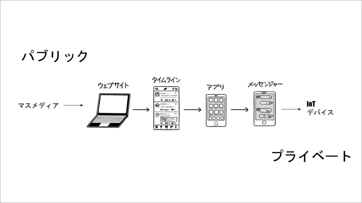 これはどういうことかというと、ネットが登場する以前は、企業の情報発信の場はマス広告が中心でした。次に90年代にネットが普及し、企業はホームページ今でいうオウンドメディアを立ち上げて自己紹介をするようになりました。00年代はソーシャルメディアが広がりました。すると企業は自社アカウントをつくって、生活者のタイムラインに自社情報が流れる工夫を始めました。そして2010年以降、スマホが普及すると、企業は自社サービスをアプリという形にして、生活者のスマホの中に入れてもらおうとするようになってきました。