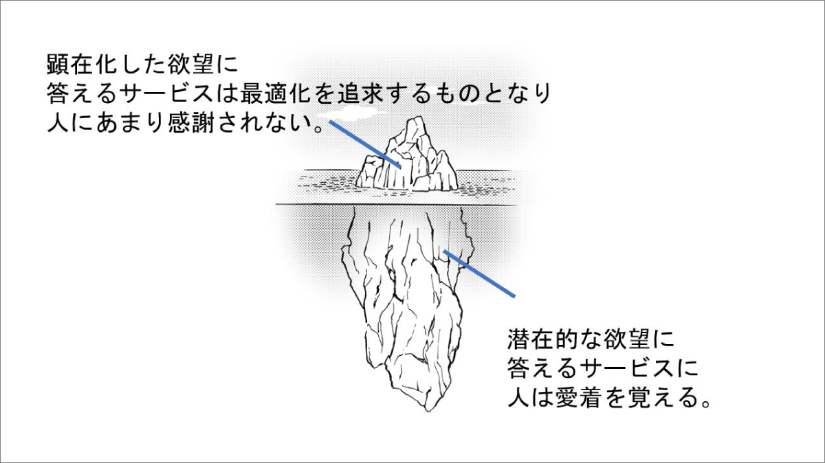 2つ目は、どうやったらラブが生まれるのかという話にもつながりますが、「インサイト発掘の重要性が増す」ことです。人は意外に不器用で、自分の欲望を完全に言語化することができません。様々な学説がありますが、人は自分の欲望のほとんどを言語化できていません。図式化すると海に浮かぶ氷山のような感じです。ネットは言語化できている欲望を満たすにはとても便利ですが、逆に言語化できていない欲望を提示することは苦手です。また、人はその「言語化できていない欲望」を言い当ててくれるサービスやプレーヤーにとても感謝する、という部分があります。