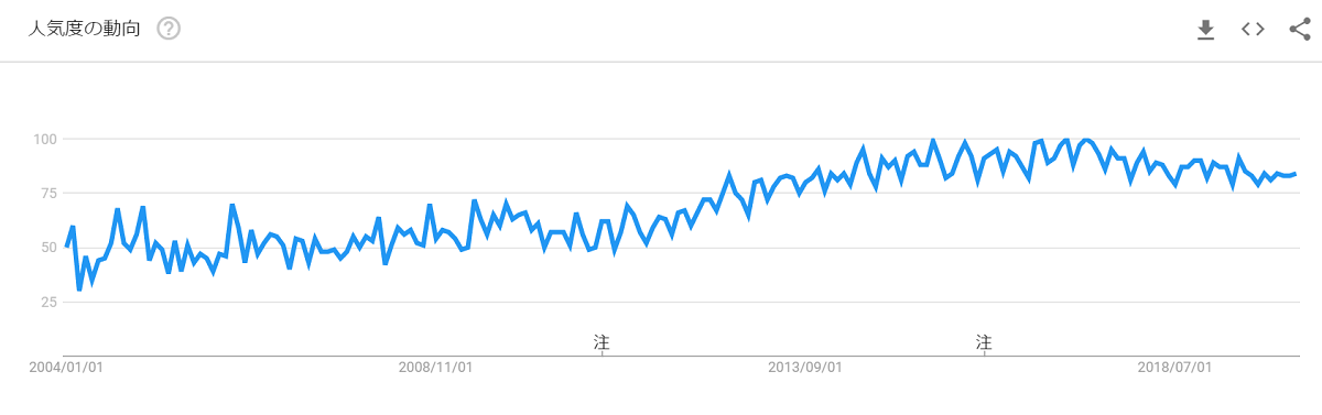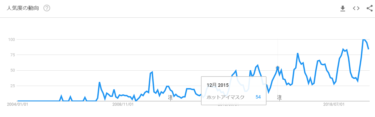例えば、ホットアイマスクは人気で、使い捨てタイプ、電子レンジで温めるタイプ、何度も使える電気式、香り付きなど多くの種類が出ています。使ってみるとわかりますが、目元が温まるだけではなく、体全体がリラックスするようななんとも心地よい気分になれます。こちらもGoogleトレンドで検索してみると、上昇トレンドにあります。毎年寒くなる11月から2月あたりに検索数が増えるようです。