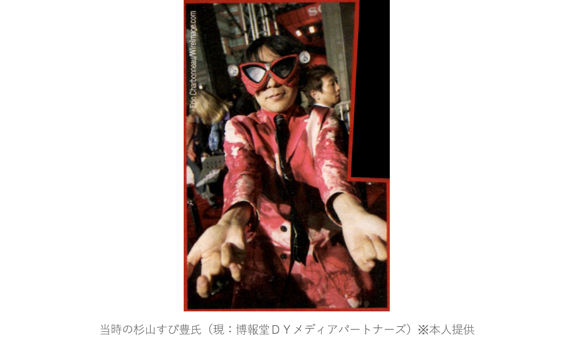 あ、携帯ストラップといえば、アメコミライターとしても知られる杉山すぴ豊氏だ! 当時PD局(プロモーションデザイン局)に在籍していた同氏は「カメレオン男」と呼ばれており、オレンジや黄色のド派手なスーツを日替わりで着ており、携帯電話にはストラップが何十個もついていた。同氏が電話をかけていると筋トレになるのではないか、と思う程だった。