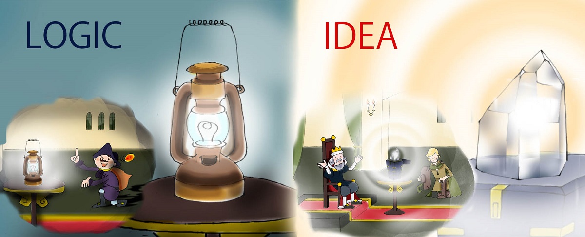 「昔々、太陽の光がささない王国がありました。あるとき王様が城にふたりの家来を呼んで、国全体を明るくする方法はないものかとたずねました。ひとりめの家来は街の中をくまなく歩き回り、最先端のテクノロジーを使った明るいランタンを見つけましたが、それでは国全体を明るくすることはできませんでした。ふたりめの家来は森の中をあてもなく何日もさまよった結果、偶然発見した錬金術を使って、森で見つけた材料を組み合わせてまばゆい光を放つ魔法の石を作り上げ、それを城に持ち帰りました。王様の前でその石が入った箱を開けると、国全体がパッと明るくなりました。」