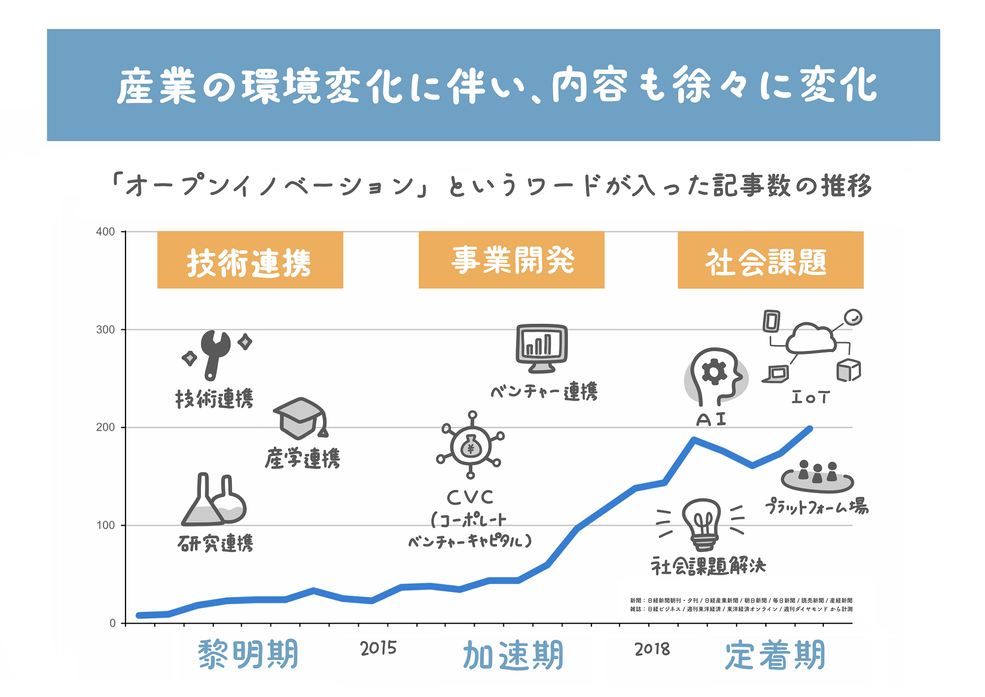 日本でオープンイノベーションに対する関心が急激に高まりを見せたのは2014年くらいからで、その頃(黎明期)は技術連携を軸とした基礎的なオープンイノベーションがほとんどでした。その後2015年~2017年(加速期)においては、オープンイノベーションを事業開発に役立てようという気運が生まれてきます。ベンチャー連携、CVC投資、アクセラレーターといったキーワードと共に、オープンイノベーションが研究開発の一領域だけではなく、経営の大きなマターとなっていきます。そして2018年から現在にかけて(定着期)は、SDGsといった社会課題解決のためというスタンスが増え、IoTやAIの活用や、フューチャーセンターやリビングラボなどの場をつくる、ネット上のプラットフォームを活用するなど、その手段も多様化してきています。