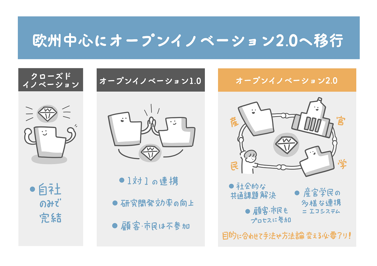 当分野で先行する欧州では、すでにオープンイノベーション2.0と言われるフェーズに入っており、日本でもここ数年でこの2.0型へのシフトが少しずつ起きています。研究開発や事業の効率向上のために1対1の連携が行われるのが1.0とすると、2.0では、産官学民の4つのステークホルダーを1つのエコシステムとして連携させながら、社会課題解決を起点に包括的に考えることが特徴です。その手法も多彩で、アイデアソンのようなものもあればコンテストもあるし、ベンチャー投資やリビングラボなどもある。これといった正解はなく、オープンイノベーションにおいては、目的に合わせて手法や方法論を変えていく必要があるのです。
