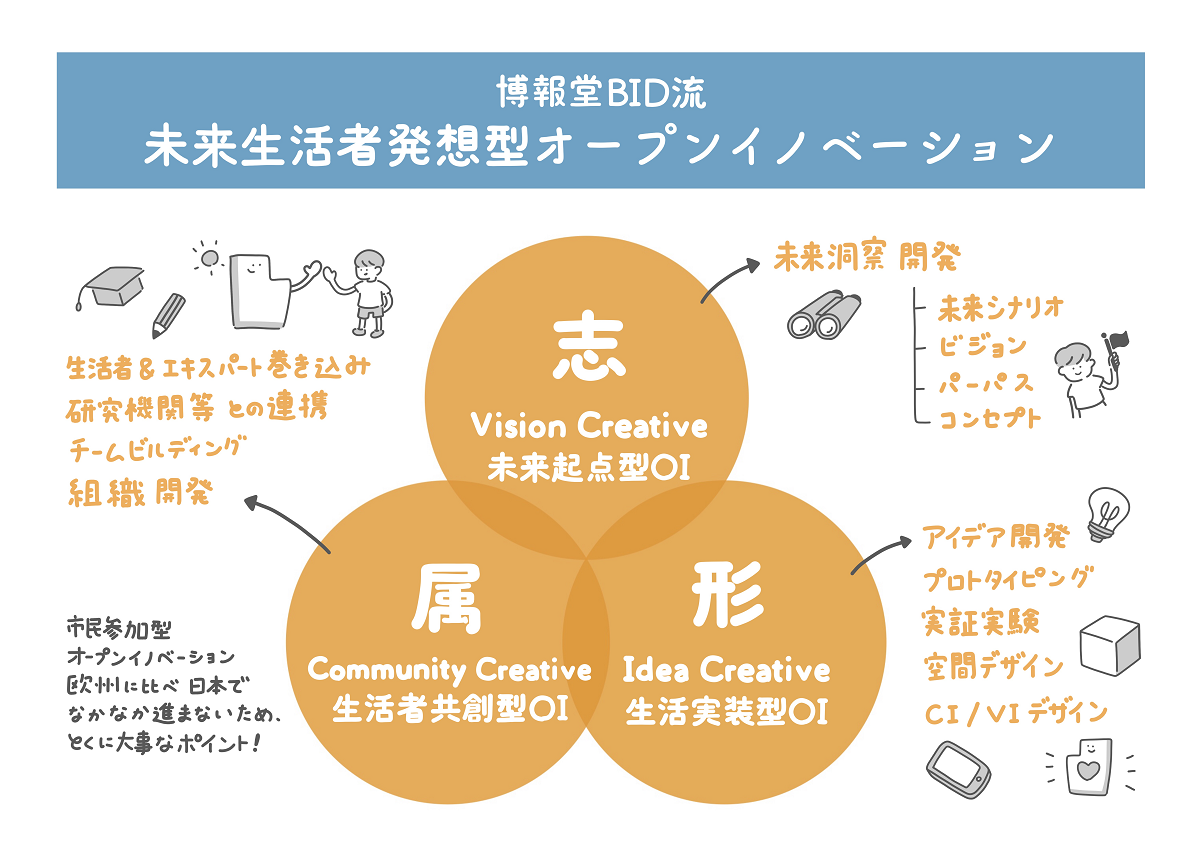 ここまで述べてきたように、オープンイノベーションを成功させるには、様々なポイントがあります。私たち博報堂ブランド・イノベーションデザイン(以下、博報堂BID)は、目的をどうつくり、どんな仲間を集め、そしてどう動かしていくかがポイントになると考えています。これは、従来から実践している「未来生活者発想型オープン・イノベーション」において、「志、属、形」という考え方で説明しています。