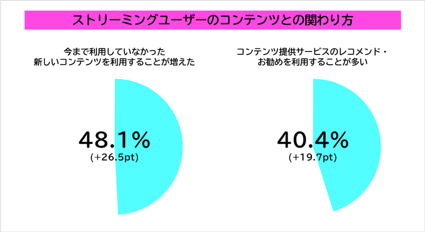 人によって音楽の聴き方は様々で、自分の好きな曲を永遠にリピートして聴く方もいれば、アプリや動画サイトのおすすめで流れてくる曲を流して聴いているといった方もいると思います。実際に、音楽配信サービス利用者のコンテンツとの出会い方に着目してみると、レコメンド機能から、これまでに興味のなかったコンテンツと関わるようになったという人が多いことがわかります。