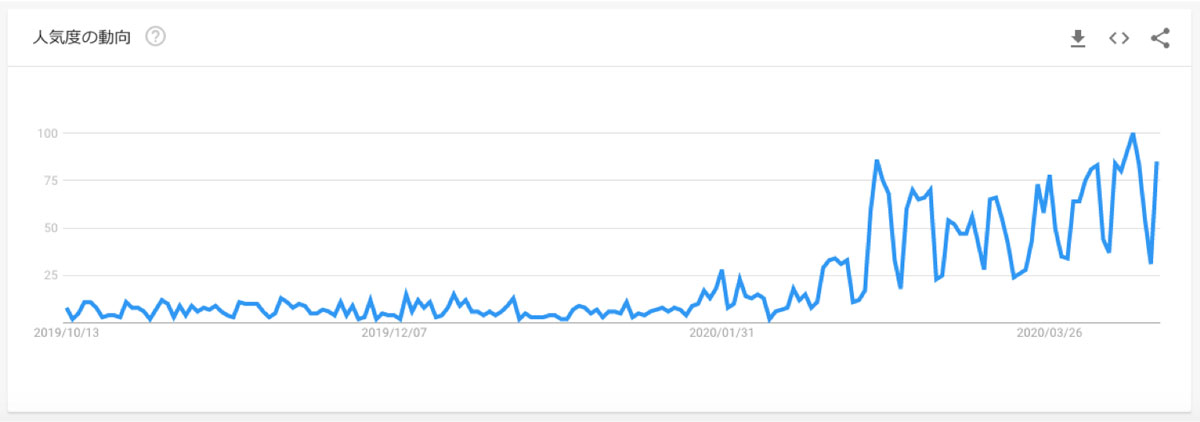 そこで、今回のテーマは「公共タッチレス」(タッチレス=非接触)です。外出した際に触れるであろうエレベーターのボタンやドアノブ、銀行のタッチパネルなどを直接触れないで利用するアイディアが増えてきています。みなさんもTVやネットで「非接触」という言葉をよく耳にするようになってきていると思います。実際にGoogleトレンドで「非接触」をキーワードとしてこの半年を検索してみても、上昇傾向にあり注目されていることもわかります。
