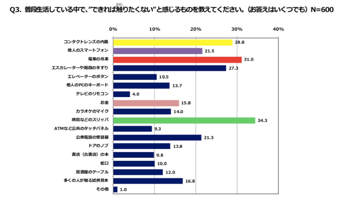 もともと日常生活の中で、「病院などのスリッパ」や「電車のつり革」など不特定多数の誰が触ったかわからないものに対して「できれば触りたくない」と約3割の人が感じていることが、下記の意識調査でわかると思います。新型コロナの影響で触れることが懸念されるようになり、「触れないほうがいい。触れたくない」「感染を防ぎたい」という予防意識の高まりが加速したあらわれではないでしょうか。