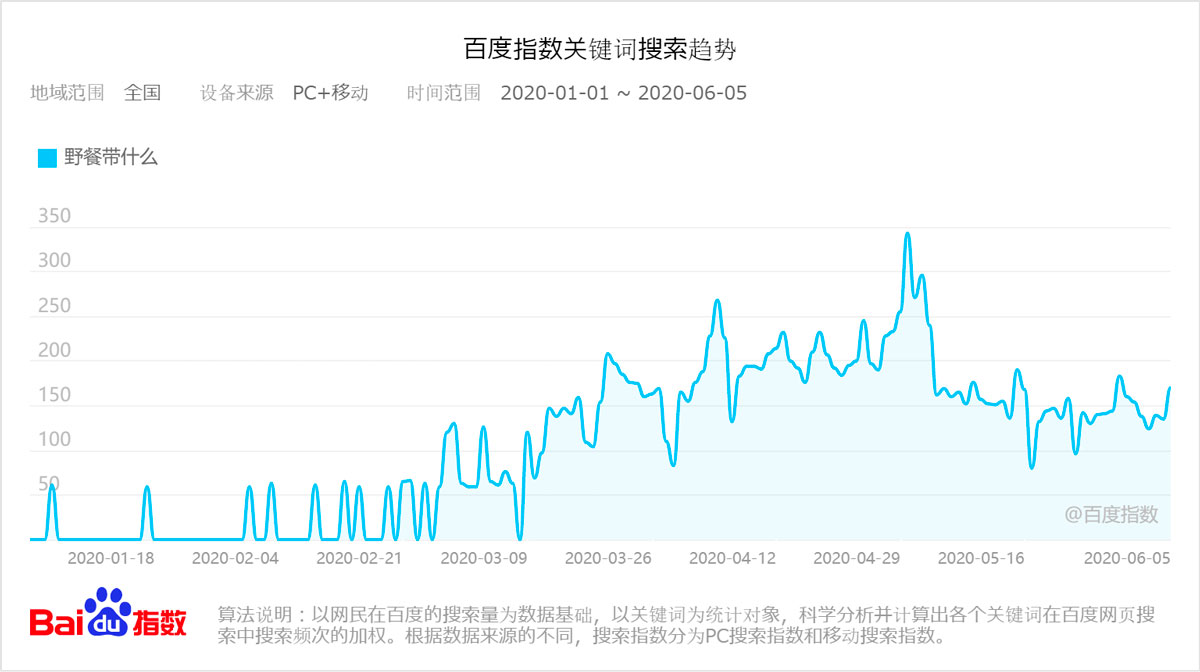ここでBaidu指数をみると、コロナ収束の兆しが見え始めた今年の3月頃から、「野餐に何を持っていくか」の検索数が一気に増え始め、5月初めのピークに達した後も、高い水準を維持しているように見えます。