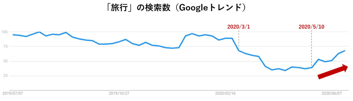 Googleトレンドで直近2年間の「旅行」の検索数を見てみると、3月ごろから大幅に落ち込んだのち、GW明けから検索数が戻りつつあるものの、例年水準までは回復していないことが分かります。生活者が、外に出て旅をしたい気持ちと、まだまだ自由に旅できる状況ではないこととの板挟みになっている様子が感じられます。特に海外旅行はまだしばらく難しいことを考えると、ますます「おうち紀行」が広がるのではないかと思います。その他、5月ごろから紀行本の売上が好調なことからも、なんらかの方法で旅行欲を解消したいニーズが広がっていることが伺われます。