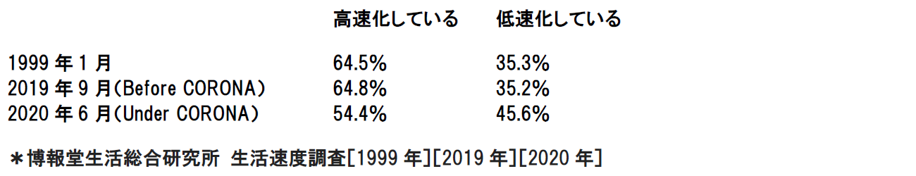 「みらい博」の中で、「生活行動(仕事、家事、遊びなど)の速度が以前と比べて、『高速化しているか?』『低速化しているか?』」という質問の調査結果を、1999年と2019年の比較で示しましたが、今回、新たに非常事態宣言解除後の2020年6月に同じ調査を実施しました。